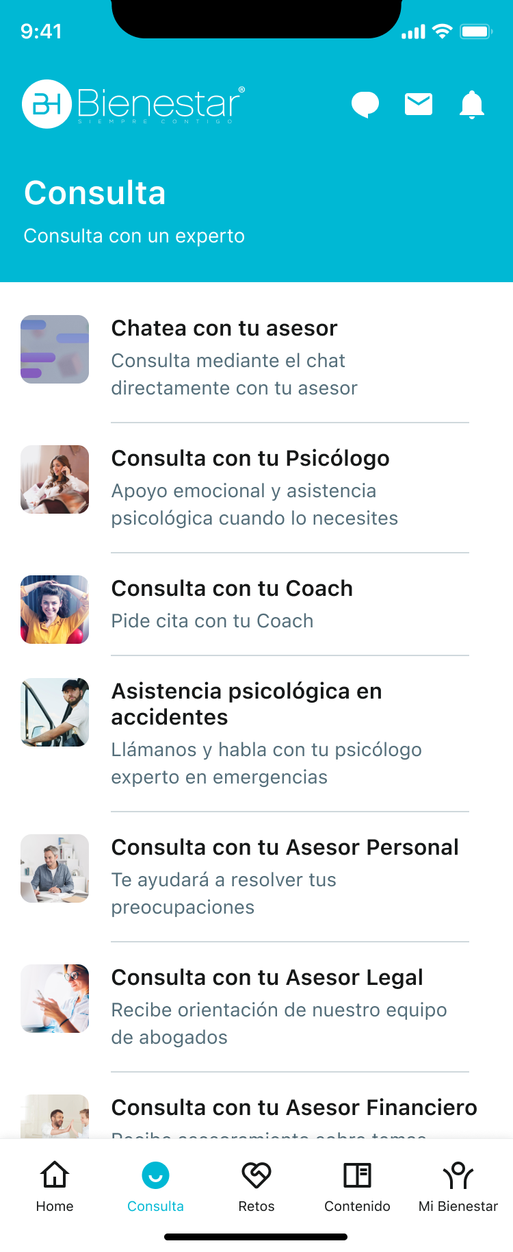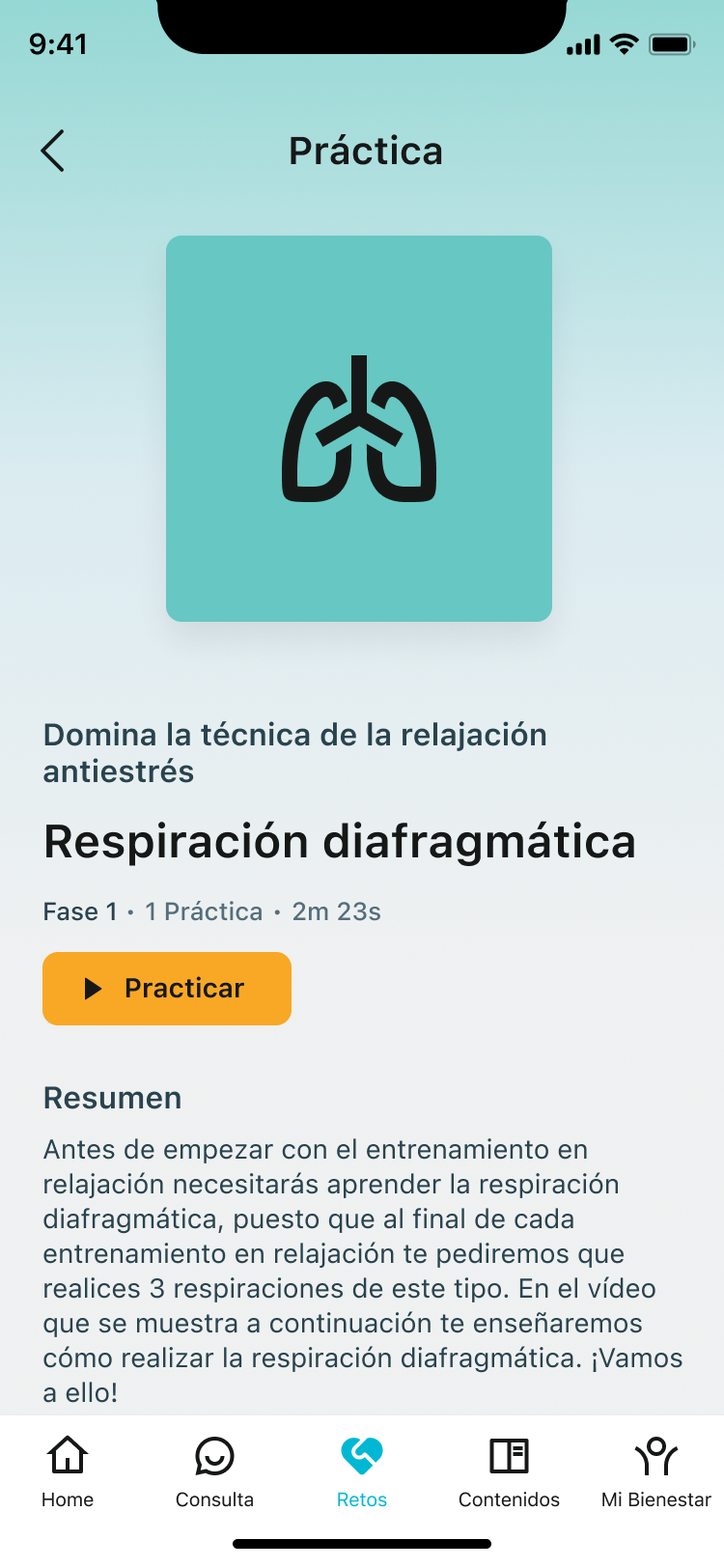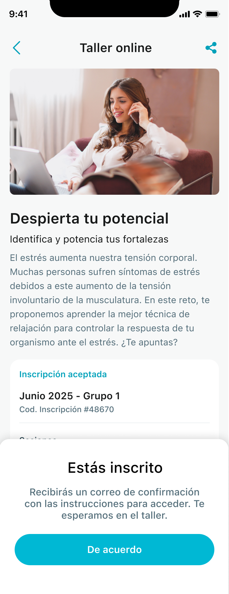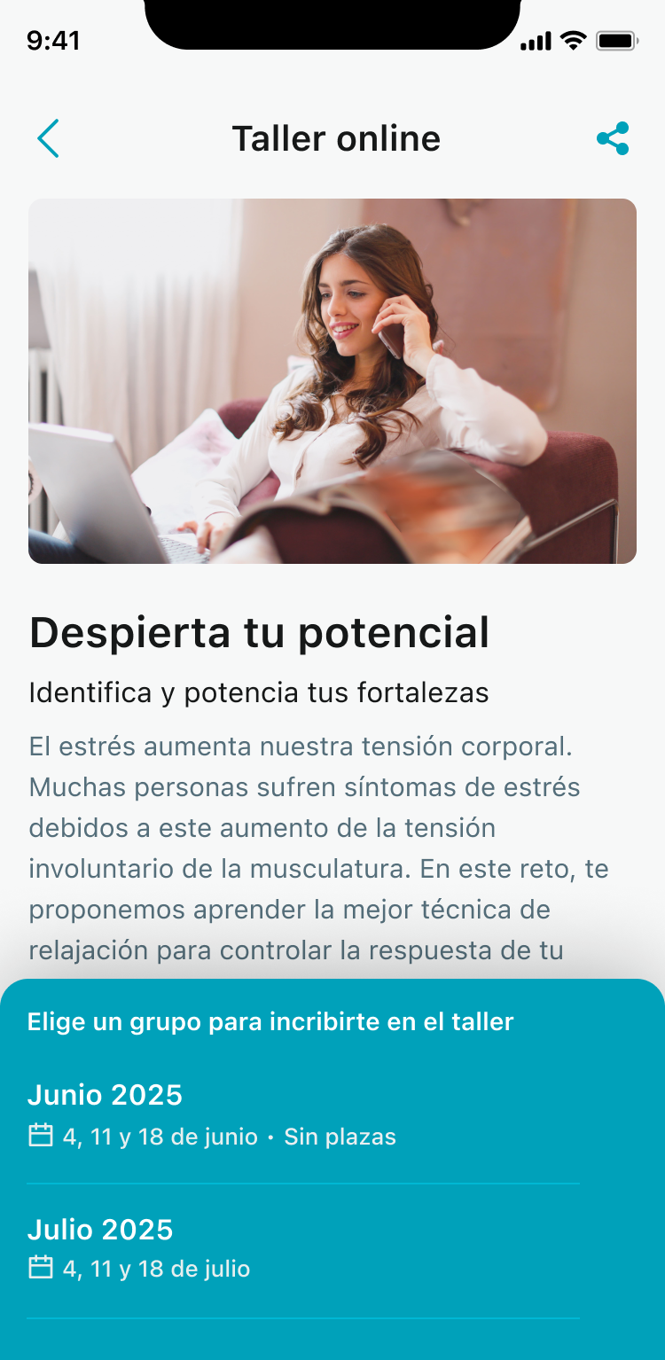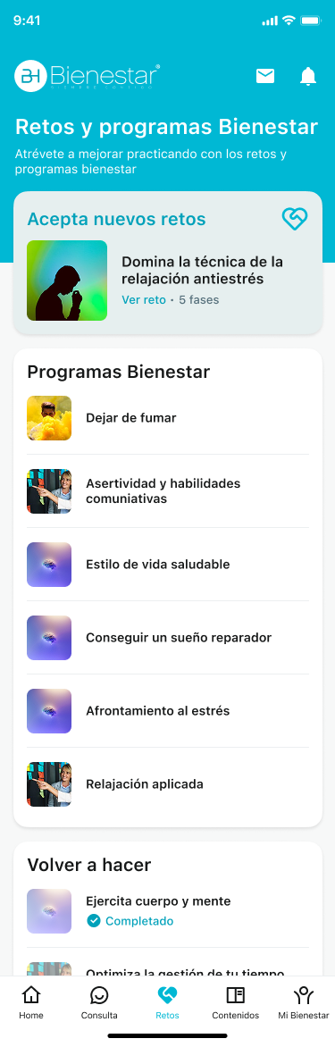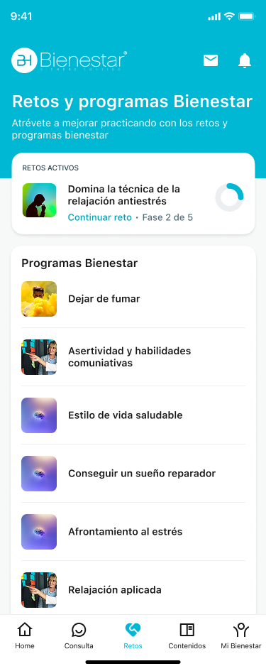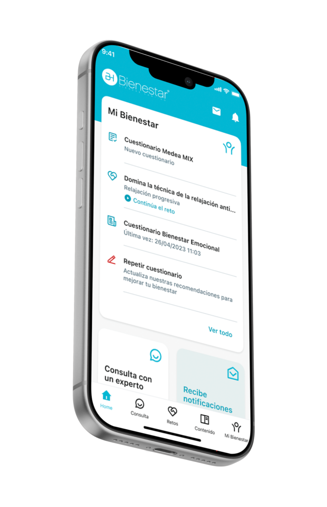 Retos y dinámicas participativas, cuestionarios de bienestar emocional, contenidos personalizados, talleres y webinars, con gestión segmentada y una experiencia centrada en la persona usuaria.