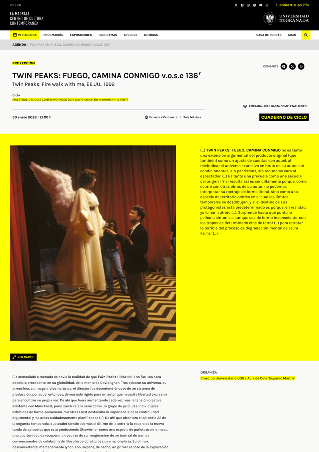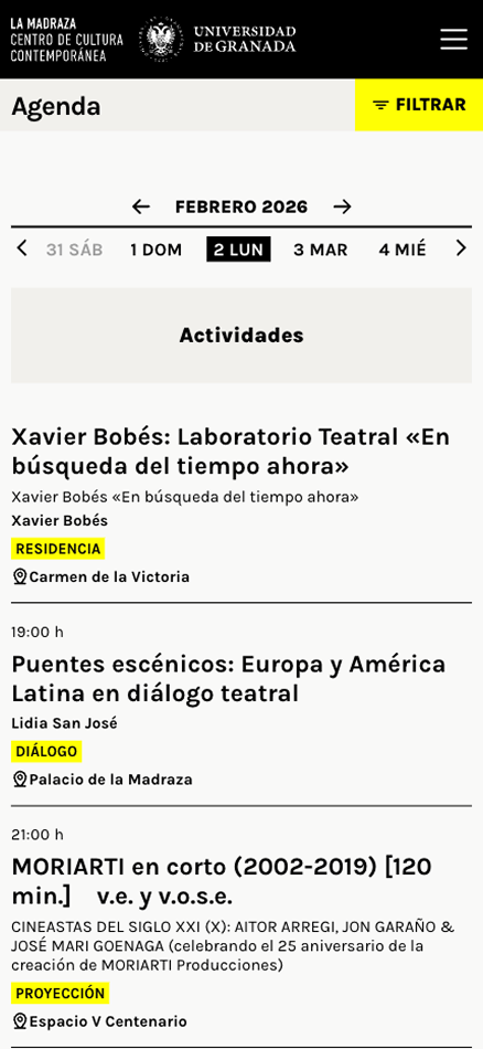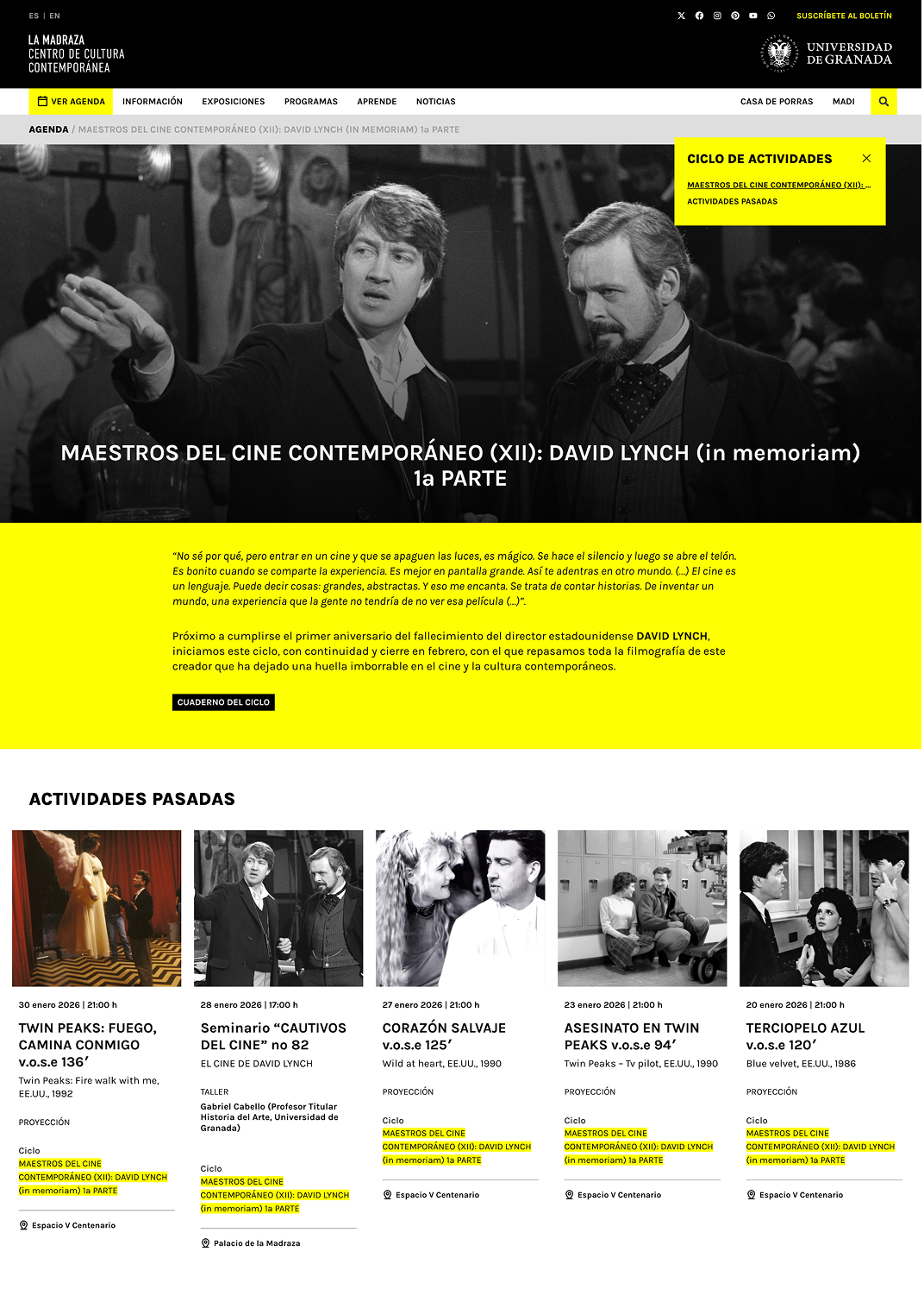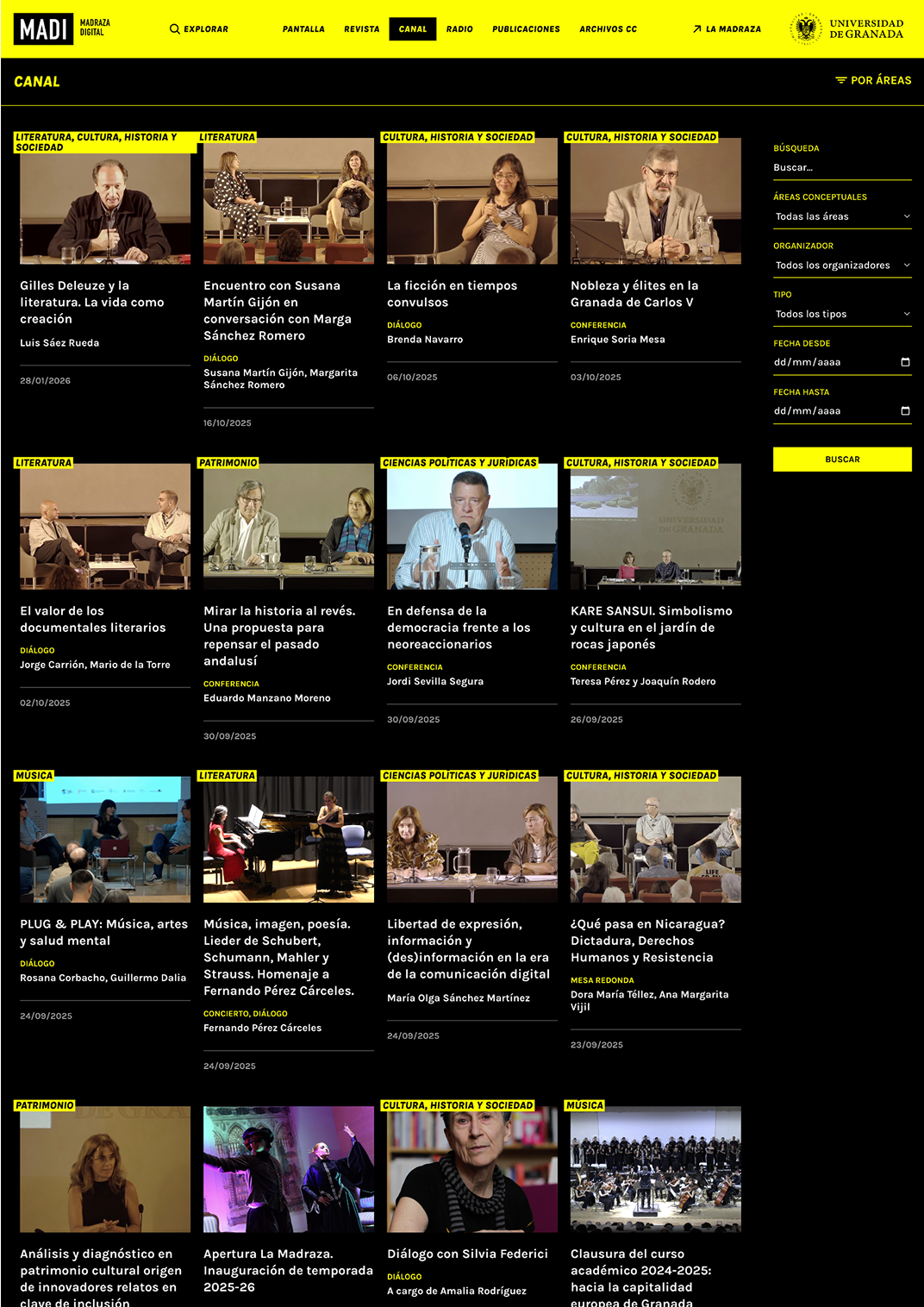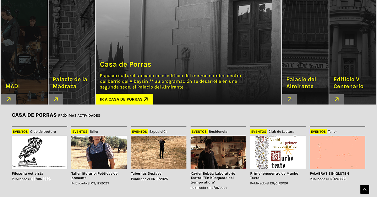 Agenda avanzada desarrollada a medida para gestionar eventos, ciclos y actividades recurrentes, organizada por espacios y líneas culturales. Archivo cultural navegable e integrado en el ecosistema digital de la UGR.