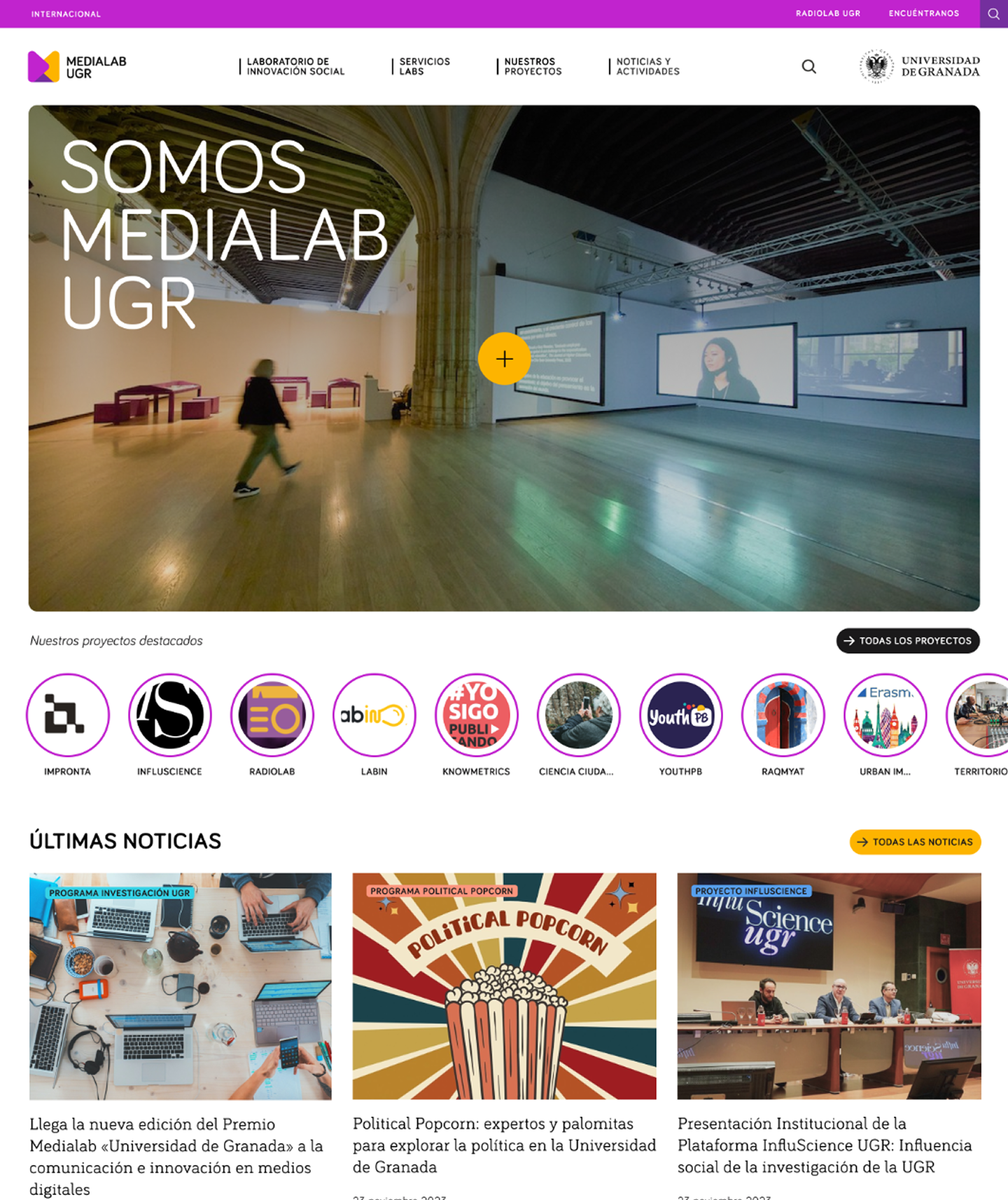 Medialab UGR es un laboratorio universitario orientado a la innovación, la experimentación digital y la transferencia de conocimiento. A su alrededor se articulan diversos proyectos satélite, cada uno con identidad, públicos y objetivos propios, pero conectados por una visión común.