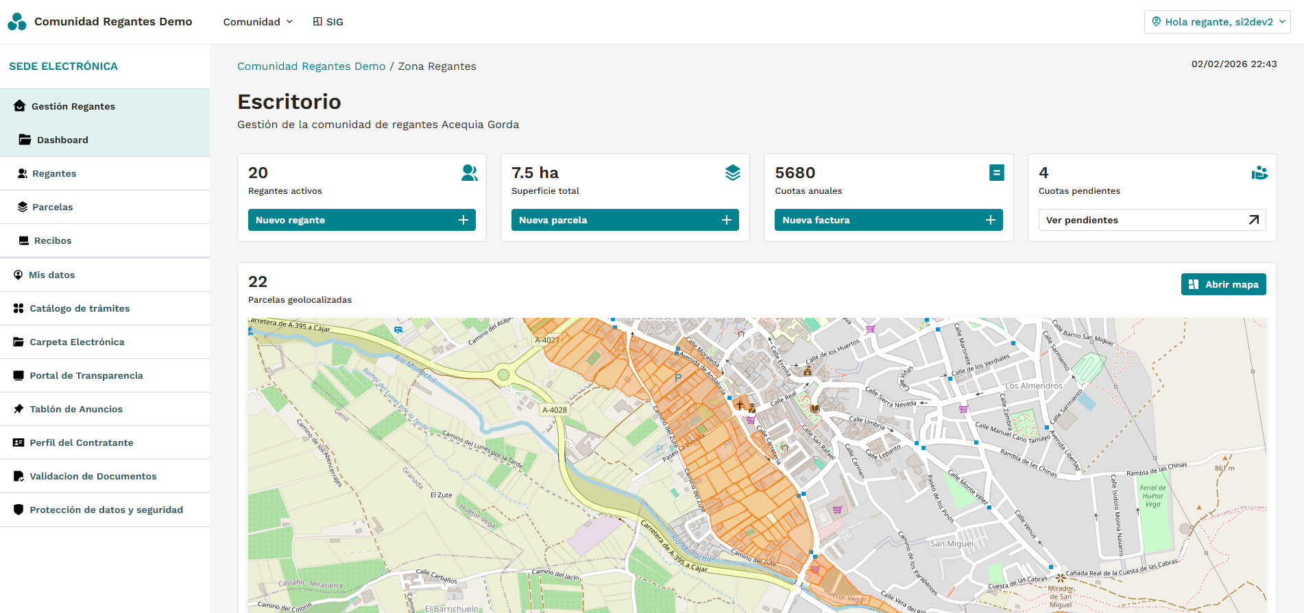 Si2 AgroGest es una solución integral diseñada específicamente para Comunidades de Regantes. Combina un programa de gestión fácil de usar, un sistema de información geográfica con capas propias e integraciones oficiales, y una sede electrónica completa para la relación con los comuneros y las administraciones públicas.
