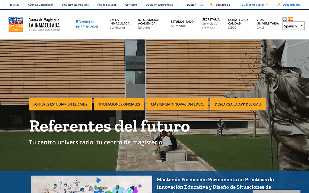 Sitio web institucional del centro universitario adscrito a la UGR, especializado en la formación de futuros docentes. El diseño refuerza la identidad educativa de la institución y facilita la comunicación entre alumnado, profesorado y comunidad universitaria.