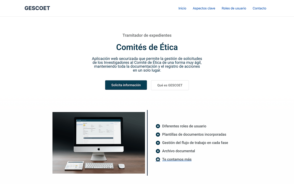Desarrollo de GESCOET, una aplicación web securizada diseñada para optimizar la tramitación de solicitudes de investigación ante comités de ética. Creada a medida para el Comité de Ética de la Universidad de Granada, la plataforma gestiona de forma ágil y eficiente todas las fases del proceso, adaptándose a los diferentes roles de usuario y permitiendo la comunicación interna y el archivo documental centralizado.