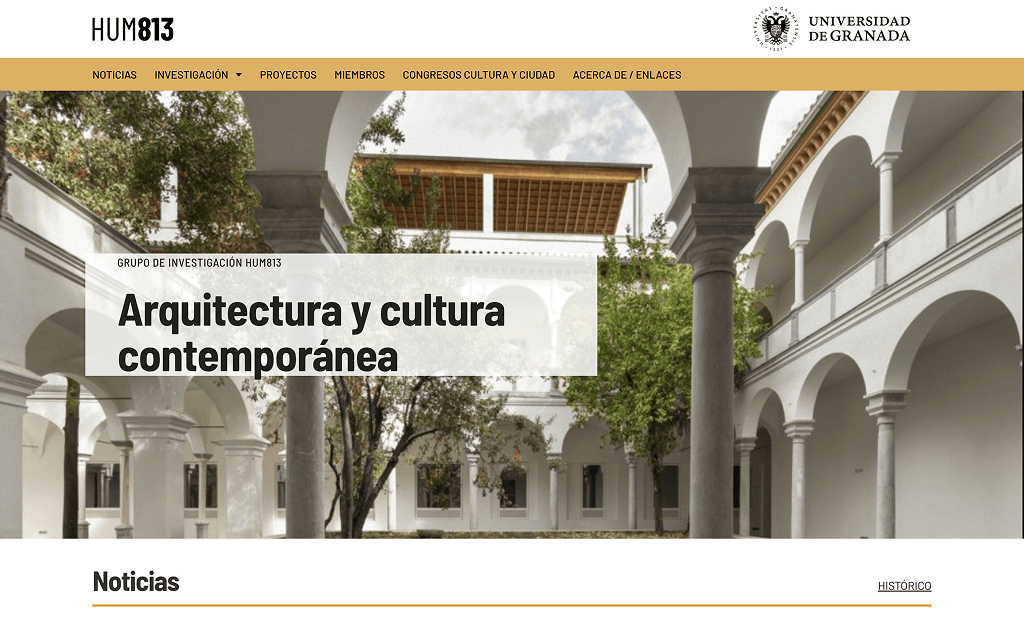 Desarrollo del sitio web del Grupo de Investigación HUM813, creado en 2004 por el catedrático Juan Calatrava en la Universidad de Granada. Este grupo interdisciplinar investiga la relación entre la arquitectura y otros ámbitos de la cultura contemporánea, como el patrimonio histórico, las artes plásticas, la literatura, la filosofía, el cine, la ciencia y la comunicación. La web presenta sus líneas de investigación, proyectos, miembros, congresos y actividades, con un diseño claro y accesible que facilita la navegación y refuerza la identidad institucional del grupo.