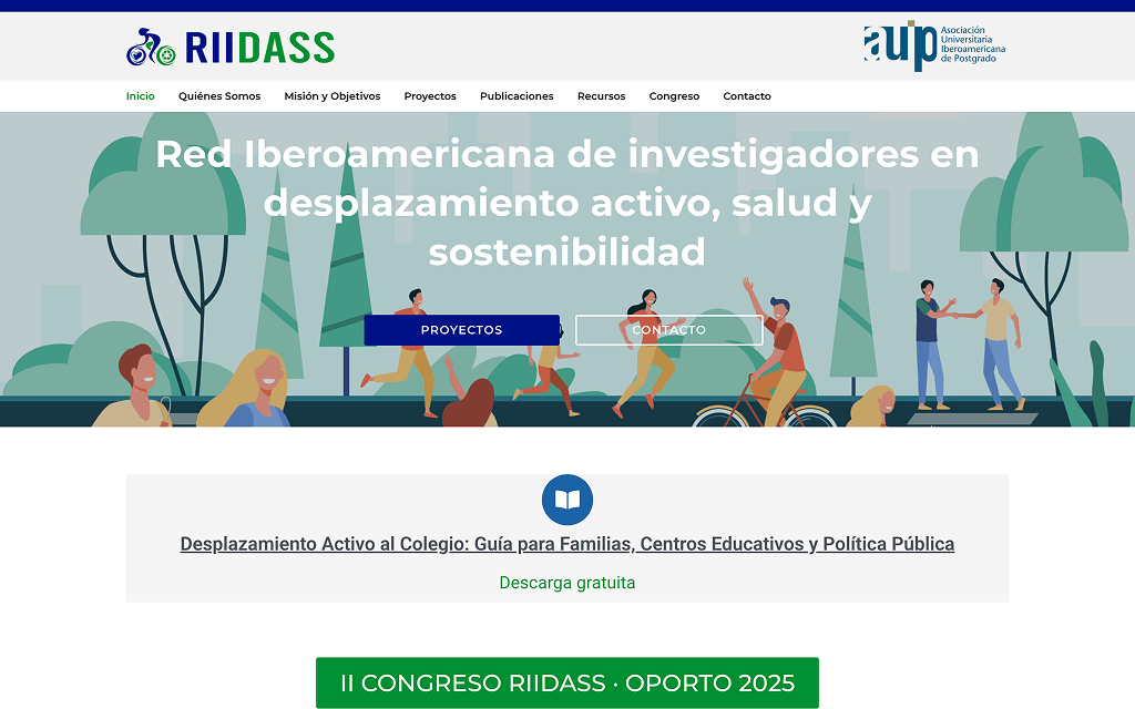 Desarrollo del sitio web institucional de la Red Iberoamericana de Investigación en Desplazamiento Activo, Salud y Sostenibilidad (RIIDASS), una iniciativa que reúne a investigadores de 8 países (España, Portugal, Chile, Ecuador, Colombia, Argentina, Brasil y México) para promover el estudio y la implementación de estrategias que fomenten la movilidad activa como forma de transporte sostenible. La plataforma ofrece información sobre la misión y objetivos de la red, proyectos de investigación en curso, publicaciones científicas, recursos e instrumentos metodológicos, y noticias relacionadas con las actividades de la red. Además, organiza eventos académicos como congresos internacionales para compartir conocimientos y experiencias entre los miembros de la red y la comunidad científica en general.